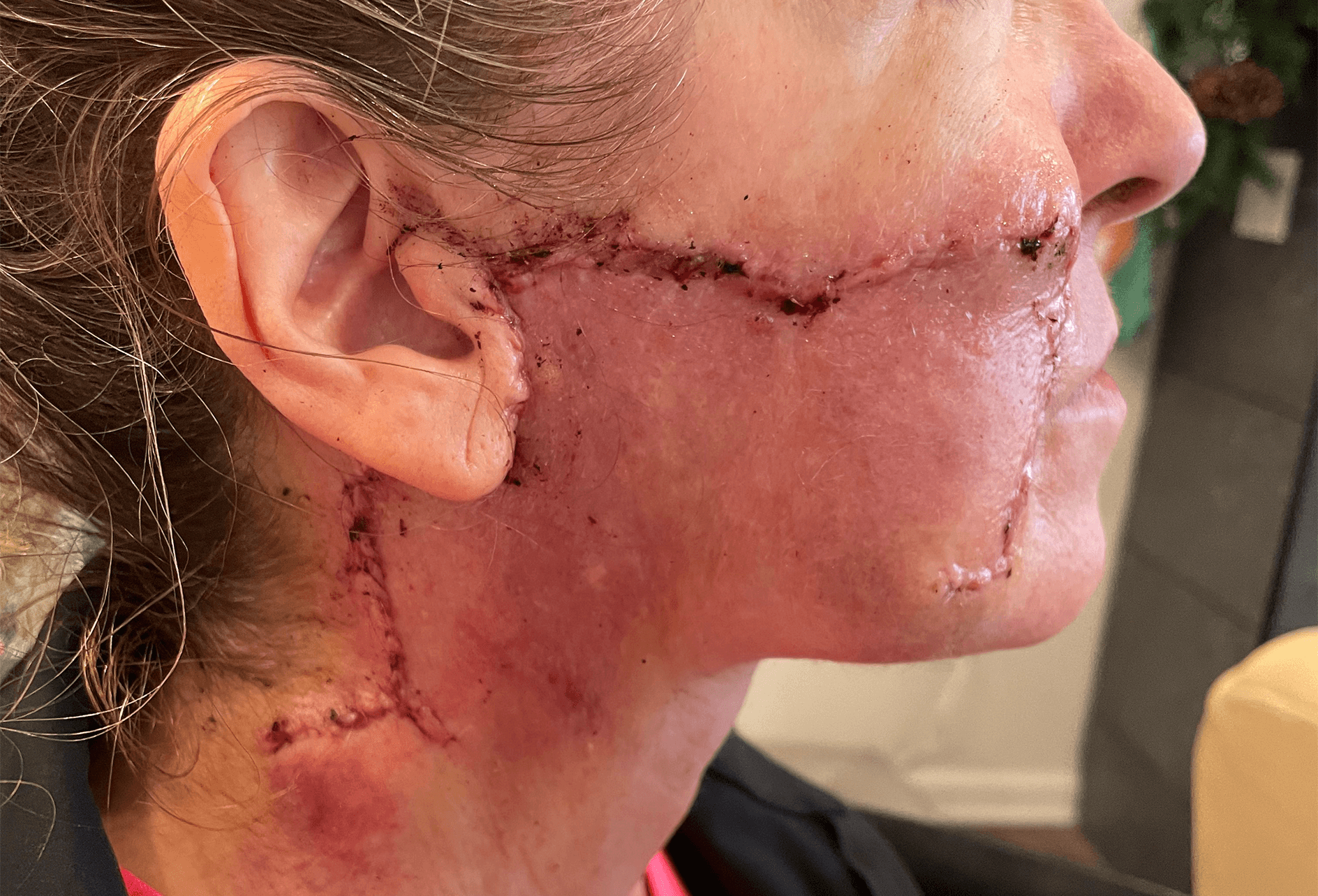 As days passed, Karin began to notice changes. By day four, the healing process was visibly underway. The area around her face was beginning to show signs of improvement, and by day seven, the wound had started to flatten out. This became a regular routine for Karin and her husband, with each bandage change revealing more progress. “It kind of turned into this thing in our household,” she laughs, “where every few days we’d take off the bandage and see how it was coming along.”