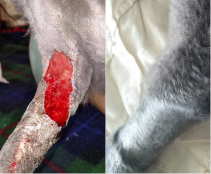 Bentley suffered a wound to his inner right front leg. After 11 days of treatment with PowerHeal®, the wound healed well, including re-growth of his fur.
