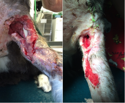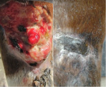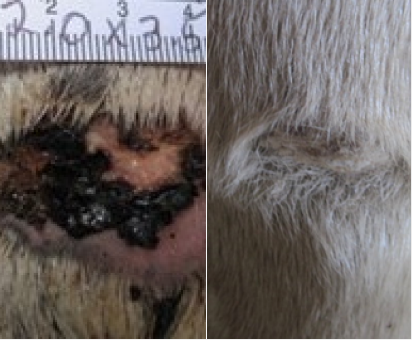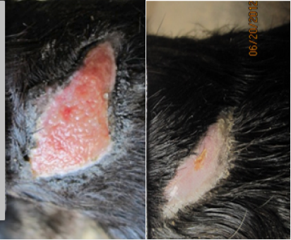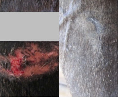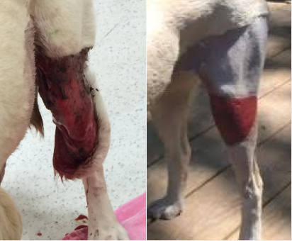Boomer had an infected traumatic injury on his back leg. After PowerHeal® bandages were applied, the infection cleared, and the wound healed rapidly. Bandaging was removed after 10 days.