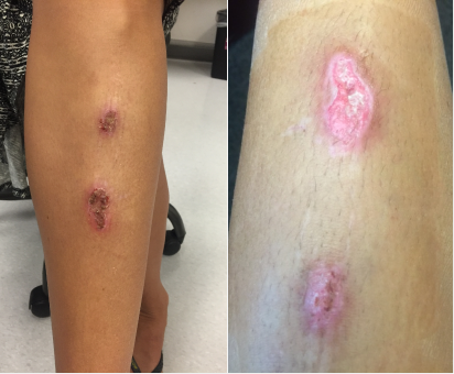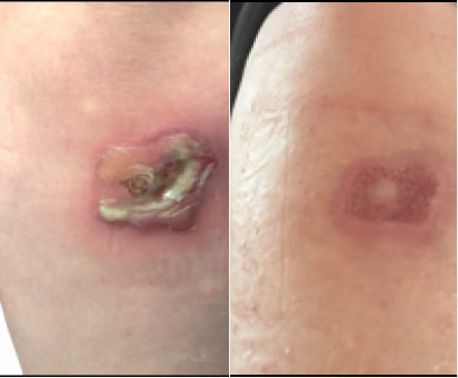 Following a dermatology procedure, the liquid nitrogen burn on Carrie’s knee became infected. She was given oral antibiotics, and her wound was debrided. She started using PowerHeal® bandages and the infection cleared. By day 21, her knee was healed enough to stop treatment.