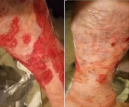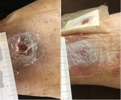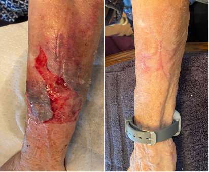 Evelyn had struggled with ulcers on her leg related to pyoderma gangrenosum, an inflammatory skin disorder, for 40 years. Numerous and varied treatments were largely unsuccessful. She applied PowerHeal® bandages for the first time in 2022. After 2 ½ weeks, her leg was visibly less red, inflamed, and painful. By 6 months, dramatic healing was achieved.