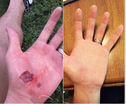 Andrew crashed during a cycling competition and injured his hand. He applied PowerHeal® bandages, and the abrasion healed completely with minimal scar evident.