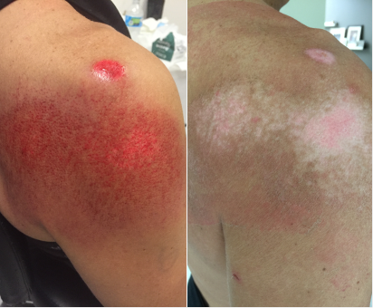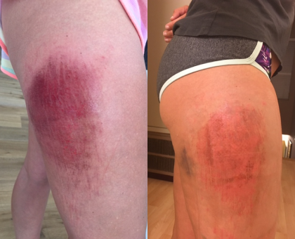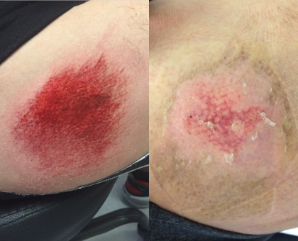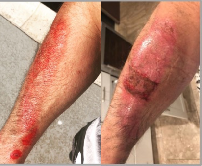Sarah had a cycling accident that resulted in extensive road rash on her hip. She immediately applied PowerHeal® bandages, and significant healing is evident after two days.