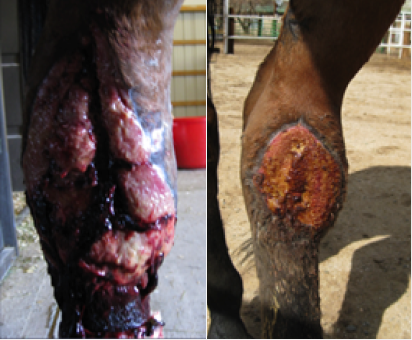 Pegasus, a former show horse, injured his left leg. After 3 weeks of treatment with standard bandages, PowerHeal® was applied. Six days later, the wound was almost 50% improved. By day 28, healing was near complete with regrowth of normal skin and hair.