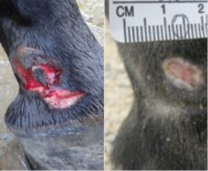 Ranger injured his right hind foot in his stall. PowerHeal® bandages were applied right away, and by day 4, healing was progressing very well. Progressive closure and regrowth of hair was observed at day 18. Ranger was almost fully healed by day 25.