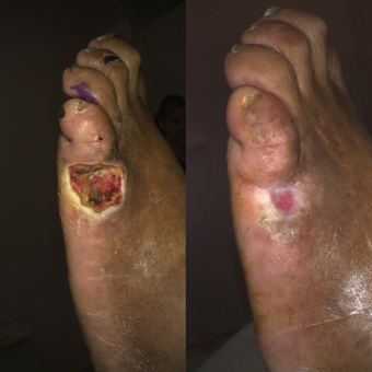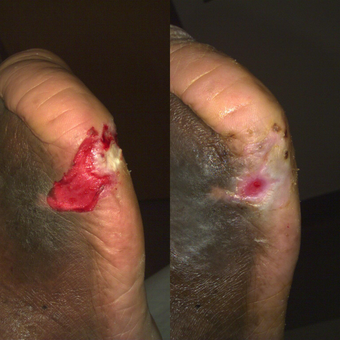 Max was struggling with non-healing wounds on the top and side of his left foot, where his toes had previously been amputated. He treated the wounds with PowerHeal® bandages. Within 15 days of treatment, healing of both wounds had progressed well.