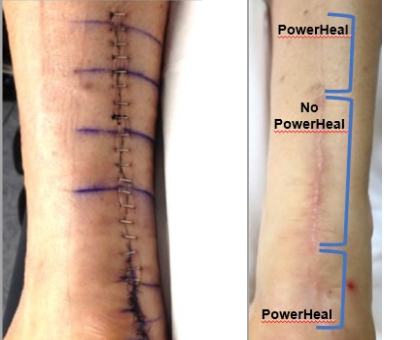 After surgery to repair her Achilles tendon, Patricia had three PowerHeal® bandages placed under her cast. When the cast was removed, she found that the center dressing had fallen off the wound at an undetermined point in time. At 9 months, the difference in scar formation with and without PowerHeal® is evident.
